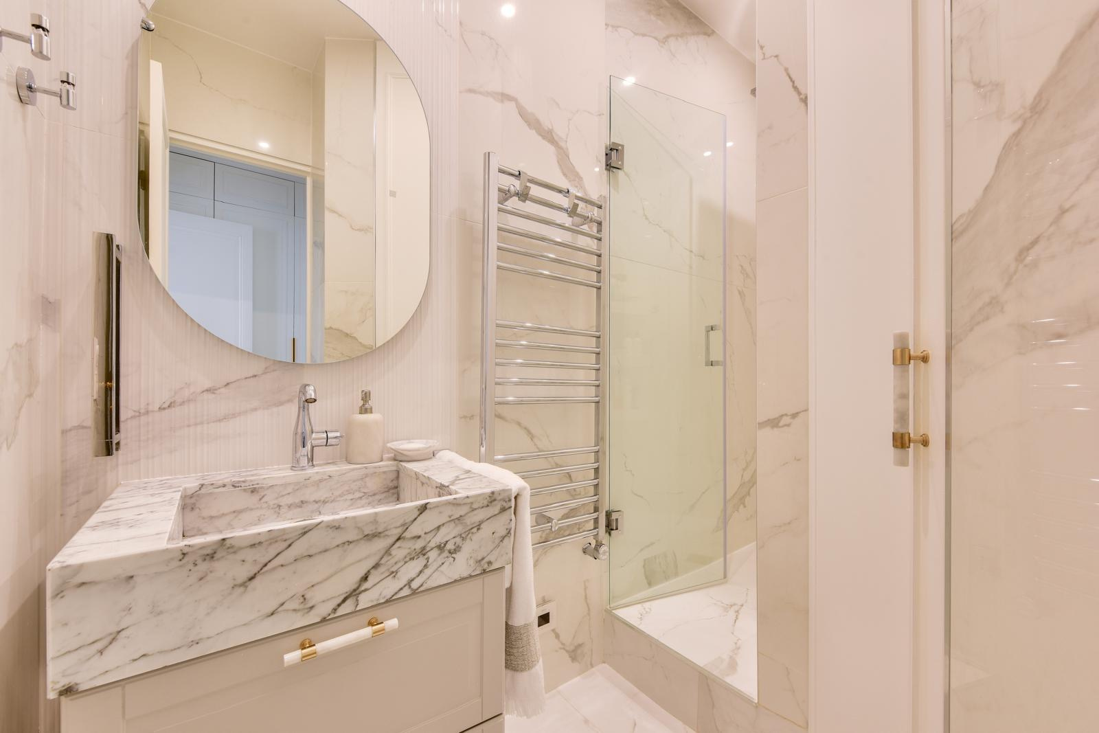 La rénovation a été menée avec un haut niveau d’exigence, mettant en valeur des matériaux nobles et des finitions soignées. Le marbre, le quartz et le laiton dialoguent avec élégance, créant une ambiance à la fois sophistiquée et intemporelle. Le confort est au rendez-vous grâce au double vitrage et au chauffage au sol dans la salle d’eau, offrant une qualité de vie optimale.