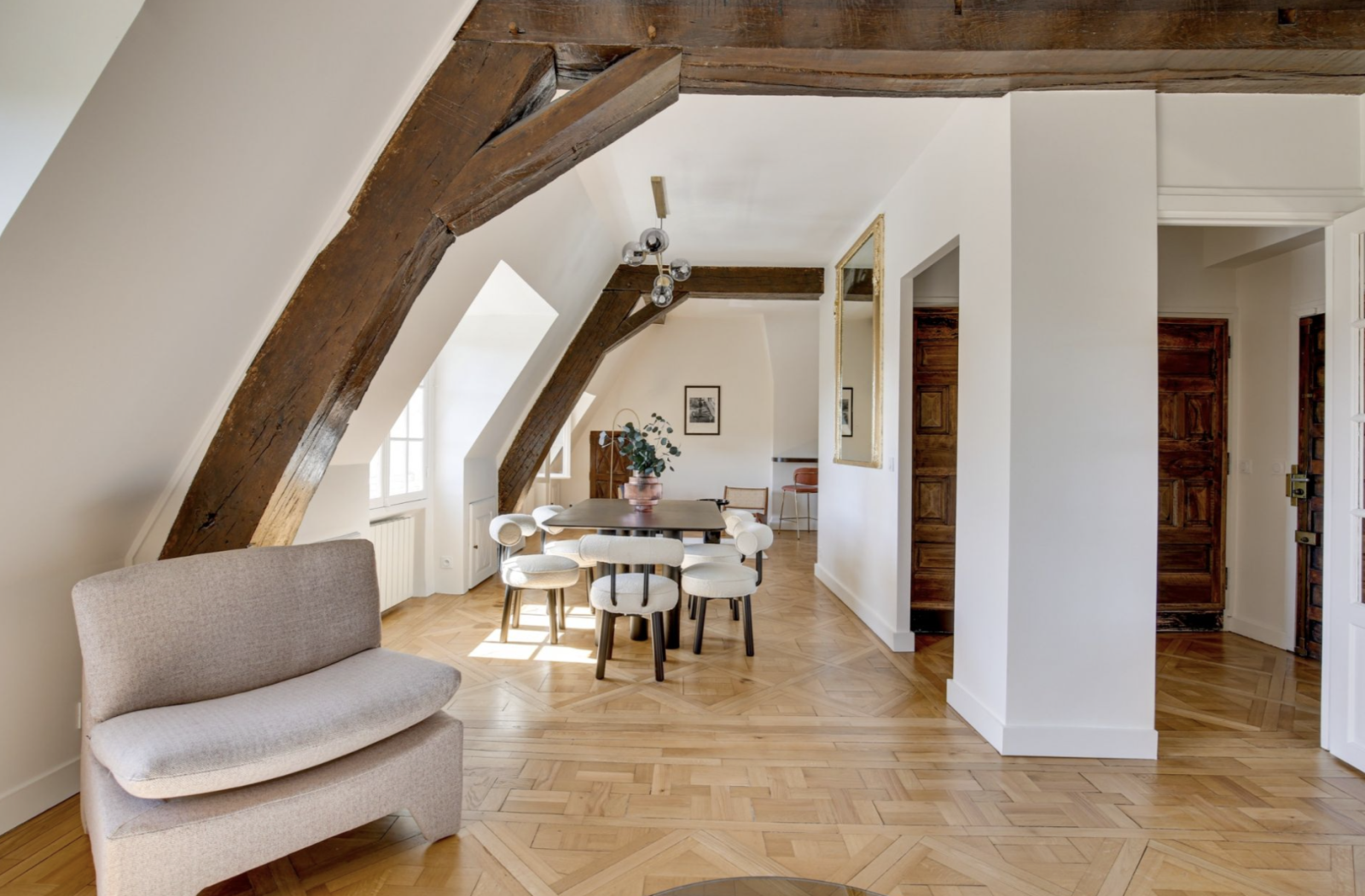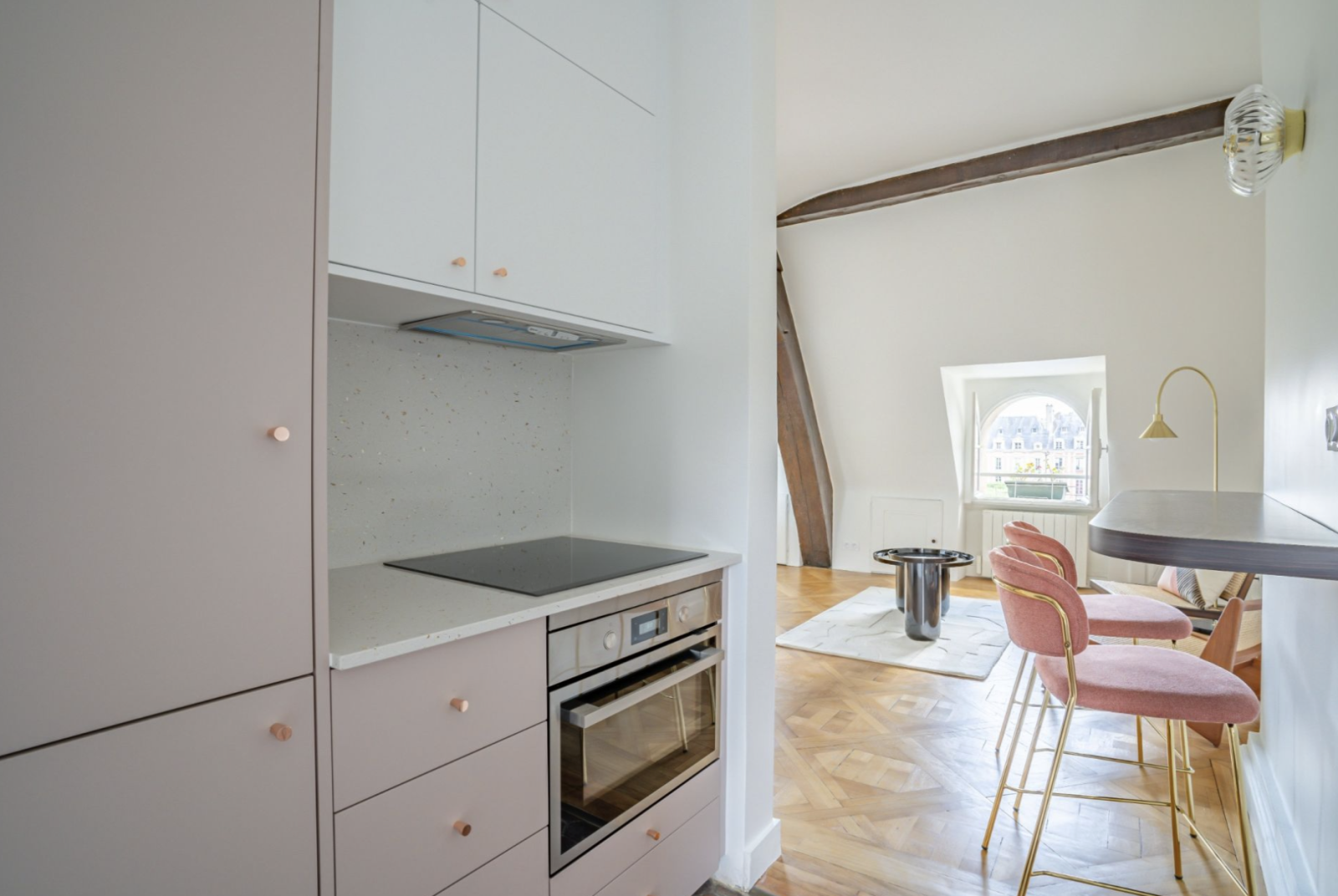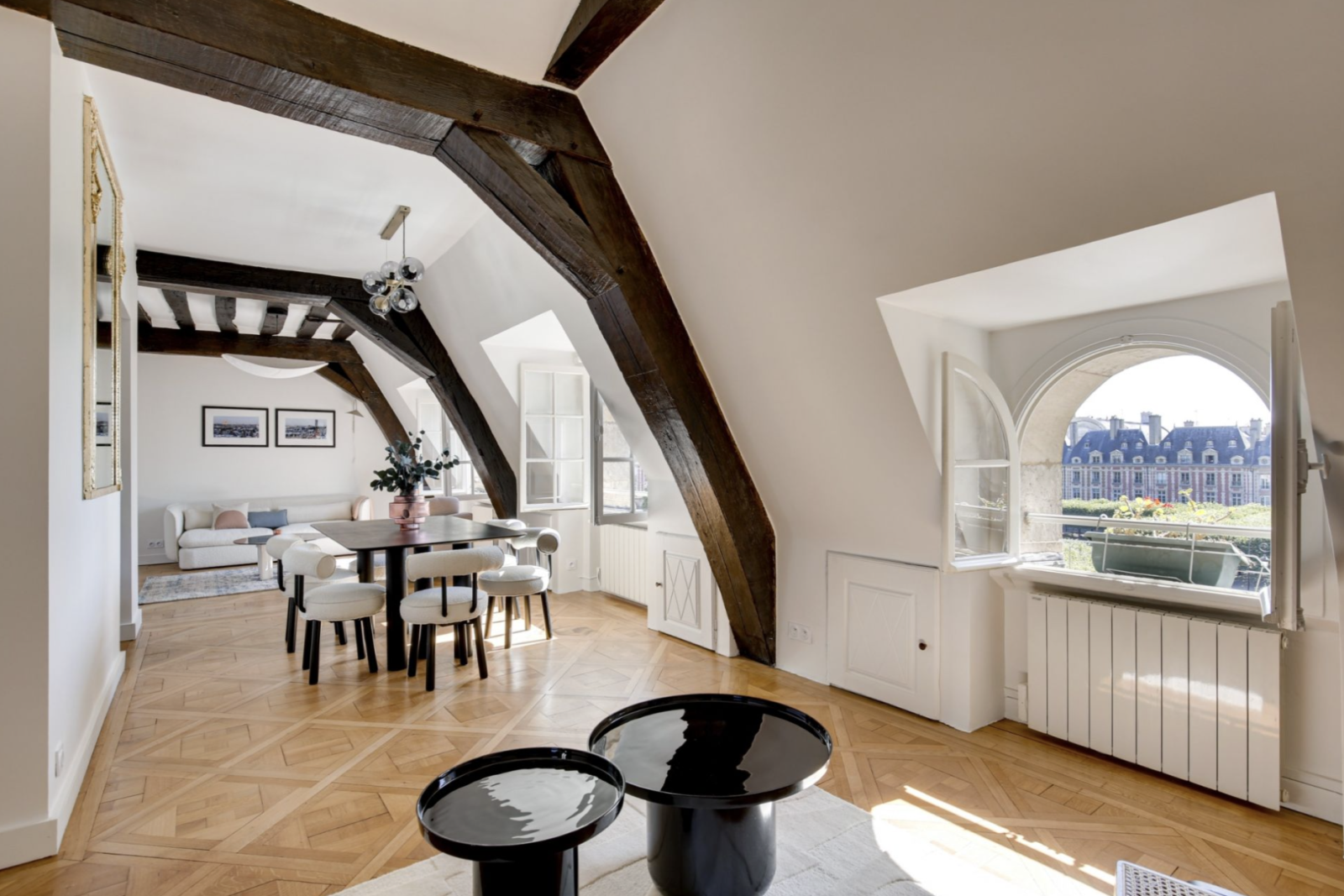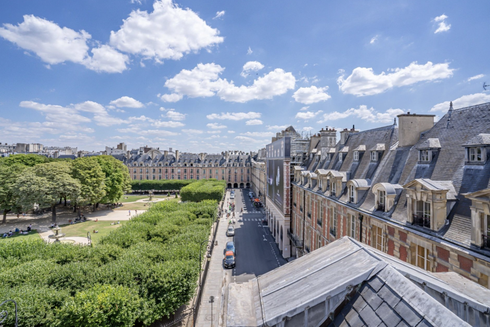 Paris (75004)Place des Vosges, dans l'ancien hôtel particulier de Chaulnes édifié en 1624, duplex au 3ème étage, refait à neuf par architecte avec vue magnifique sur la place des Vosges. Nous vous proposons un appartement traversant et baigné de lumière de 60,71 m² loi Carrez et 87,88 m² au sol. Il se compose au 1er niveau, d'un double séjour et d'une salle à manger donnant sur la place des Vosges, d'une cuisine ouverte donnant sur l'hôtel de Sully, d'une salle d'eau et d'un wc indépendant. Possibilité d'une deuxième chambre dans le salon. Au deuxième niveau, une chambre avec toit cathédrale et poutres d'origine avec un espace dressing et un bureau. Charme de l'ancien conféré par poutres et parquet de Versailles. Deux greniers situés au 2ème étage complètent ce bien. Stationnement possible dans la cour de l'immeuble. École : Les Francs-Bourgeois. Pour planifier une visite, entrez rapidement en contact avec Paris Vendôme Luxury - International Realty.