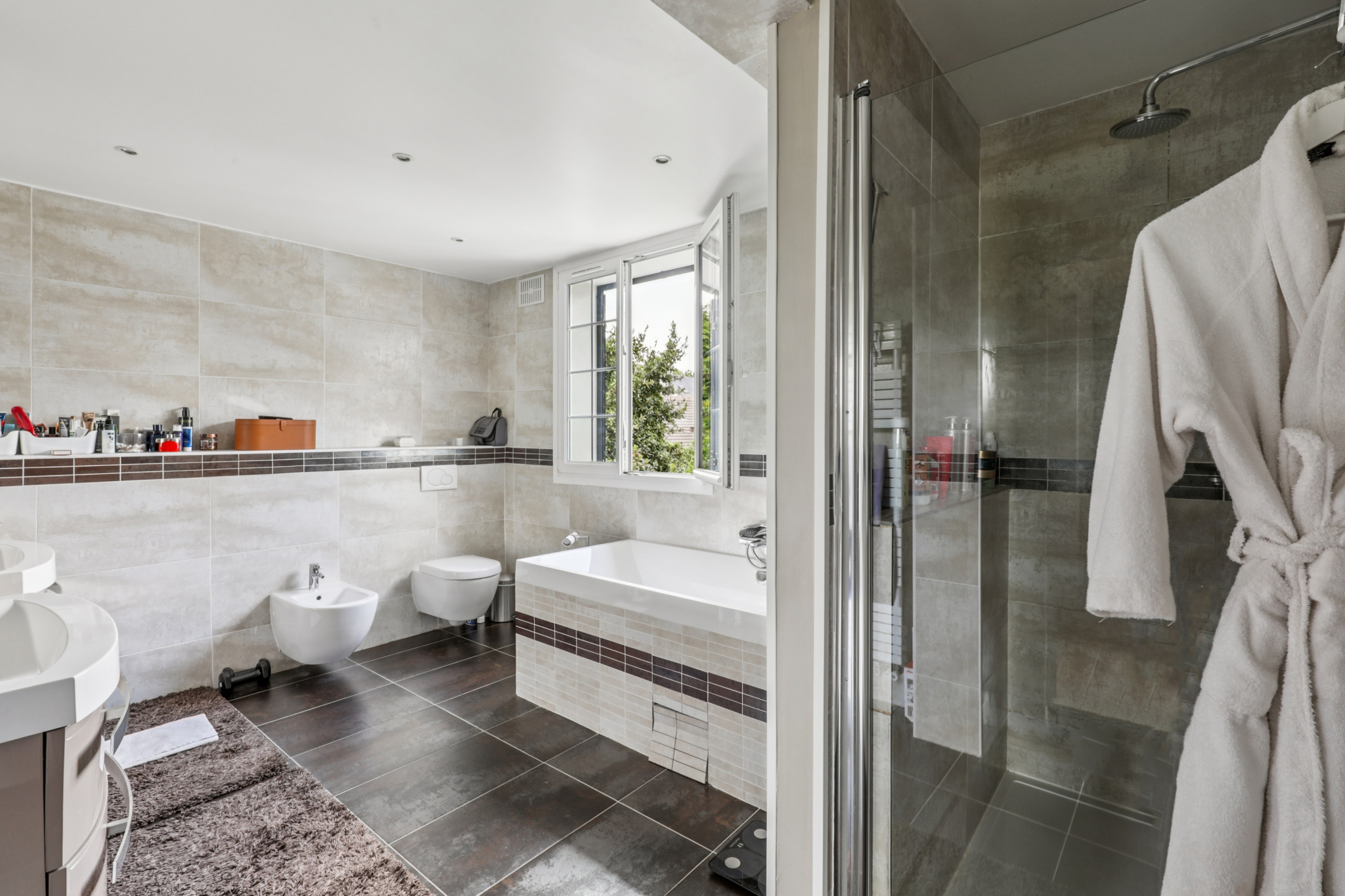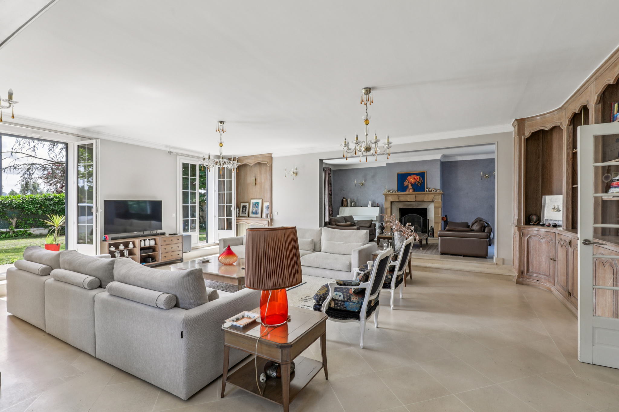 Elle propose une triple réception avec cheminée, une cuisine dinatoire, ainsi qu’une vaste suite parentale comprenant salle de bains et dressing. Trois autres suites disposent chacune de leur propre salle d’eau, tandis que deux chambres supplémentaires se partagent une salle de bains. Un sous-sol total offre un garage, une salle de jeux, une salle de cinéma et une chambre.